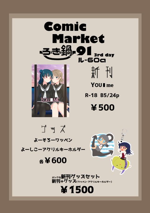 3日目ル-60a【ろき鍋】のお品書きです。ようよし本⚓️😈とアクリルキーホルダーとワッペン作ってみました。当日はよろしくお願いします!!