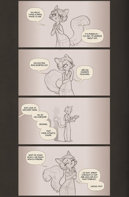 A quickie comic from an April 1st live chat we held on the Lackadaisy Discord (https://t.co/L1iHAA2a5h) with some of the team working on the animated film. We hit our big Mordecai stretch goal (!!!) so I figured I'd share>