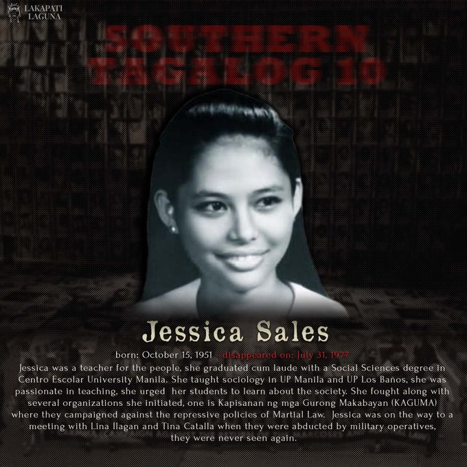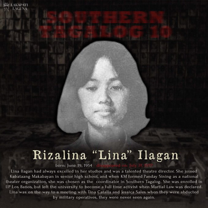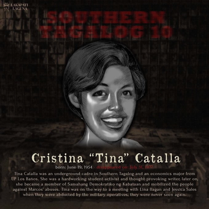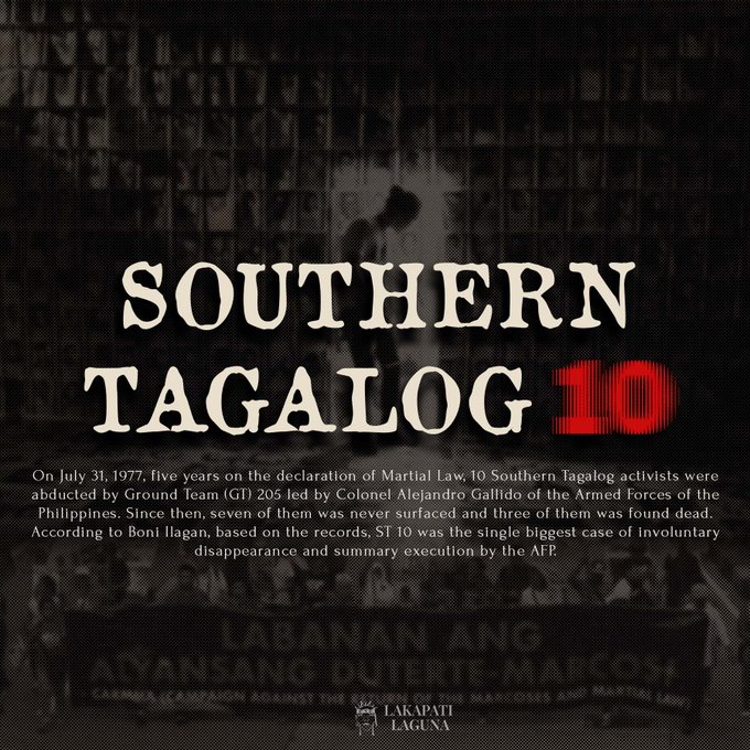 Sa nalalapit na ika-50 anibersaryo ng deklarasyon ng Batas Militar, muli nating sariwain at pagpugayan ang dakilang pakikibaka ng Southern Tagalog 10, ang isa sa pinakamalaking kaso ng sapilitang pagkawala sa panahon ng diktaduryang Marcos. (1/n)