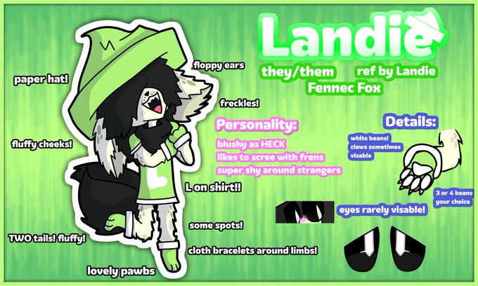 @cxryozier here is Landie!! i tried my best to make them unique, and represent me as a person,,, they are a fennec!! art in order by @/YokuGrapeCrepe, and the last two by me