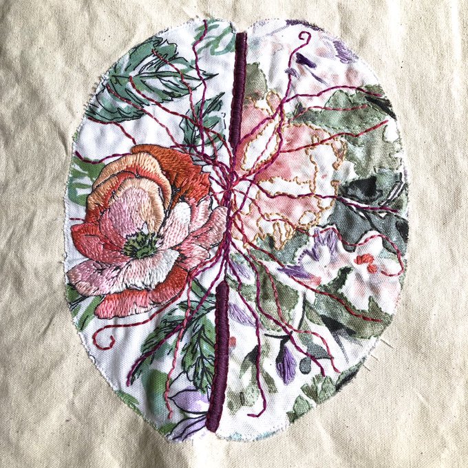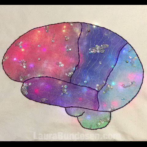 Work in progress: have I gone too far or not far enough? Using thread and French knots I wanted to bring the colors from each cerebral lobe into the others to indicate the interplay: 1st pic unlit - 2nd pic lit