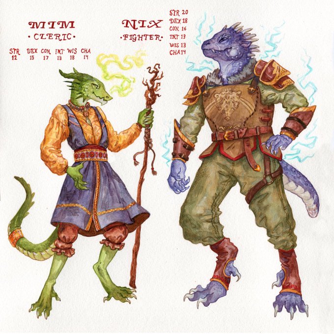 Gouach watercolor painting of dnd characters sheets, dragonborn cleric and fighter, and my human bard character Sylvia Oscine