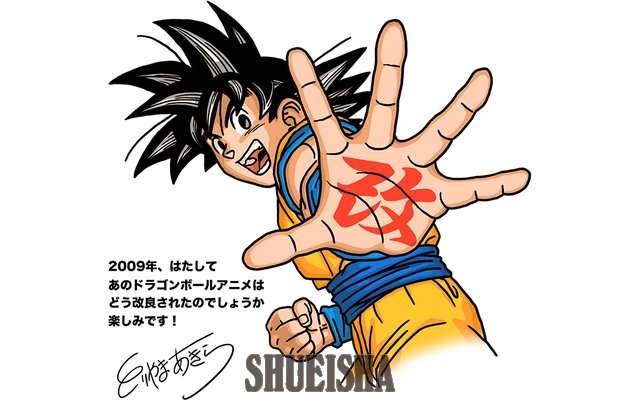 L'illustration & message de Toriyama révélée avant sa diffusion avec le caractère 改 sur la paume de #Goku est "kai" ("à nouveau"). Toriyama dit : "Nous voici en 2009 et j'ai très hâte de voir comment l'anime DB a été amélioré !"