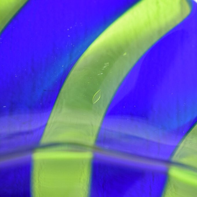 職人により1点ずつ吹きガラス製法によって製作されており、青と黄緑の2色が中心から外側へ、不規則なラインを描きながら広がるハンドメイド作品らしい表情が魅力的です。