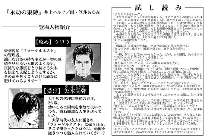 【4/10発売予定!】『永劫の束縛』井上ハルヲ/画・笠井あゆみ◆友人に騙され豪華客船内の娼館に売られた矢木。そこに君臨する「クロウ」という男は、感情を見せない人形のような美丈夫で――!? 攻めの人は読み進めるほどに可愛げが出て来るタイプだと思います。ぜひどうぞ。