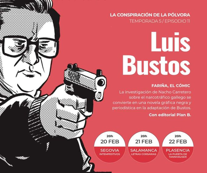 El sábado 22 de febrero a las 20h. presentación, encuentro y firmas con el dibujante Luis Bustos y el cómic de "Fariña", según el libro de @NachoCarretero. Publicado por @editorialplanb, cierra en La Puerta de Tannhäus ruta con @LibrerosPolvora Más info en https://t.co/fALTkdArFw