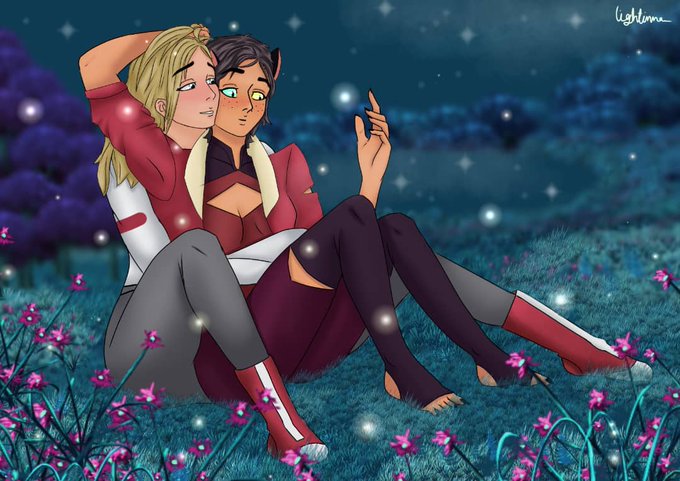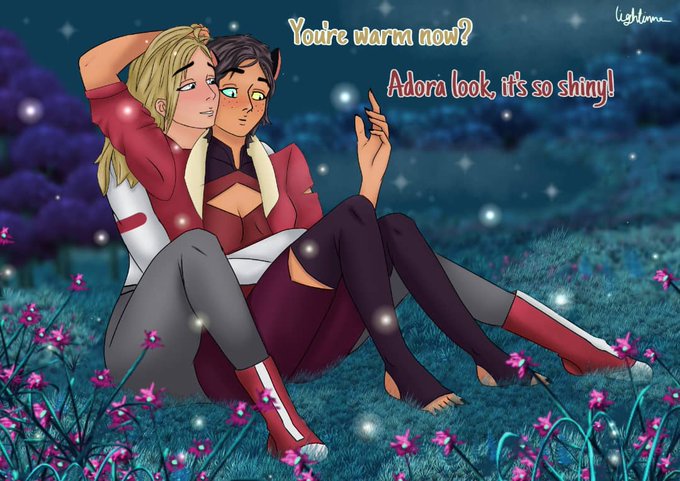 CatrAdora were off to whispering woods when they found a new part in it.Catra is wet;That's because she fell into the lake when a firefly came to her and scared her😆Adora tries to warm her.Catra is attracted to those moving stars🌟