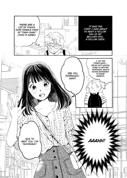 After a fan meet-up with their favorite idol, Rodriguez and Takowasa meet in person to go drinking together. When she first saw Takowasa, Rodriguez was surprised that Takowasa looked a lot like the idol they adored.