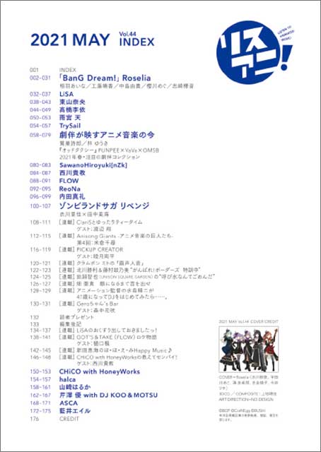 連載:新田恵海/畑 亜貴/PICKUP CREATORS(ゲスト:睦月周平)/FLOW(ゲスト:樋口楓)/ボーダーズ(北川勝利・藤村鼓乃美)/水島精二/ミト(クラムボン)/LiSA