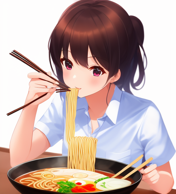 キャラ(アンルシア)とラーメンイラストを別々で学習し、同時に使うことで、ラーメン食べてるアンルシア的な画像を作成できます