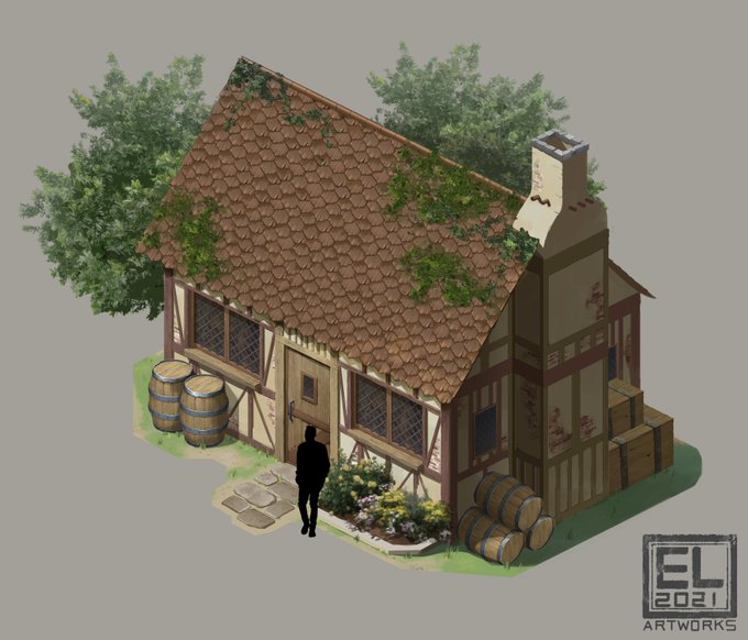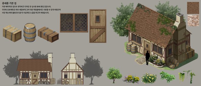 저번에 그렸던 실사풍 중세 집 작업. 저렇게 오브젝트랑 텍스쳐 다 따로 그려놓고 조립하는 건 자주 안 해봤는데 확실히 디테일이 다르다