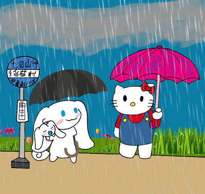 Sanrio's characters #HelloKitty and #cinnamoroll, at the bus stop from My Neighbor Totoro, doing a hadouken movie. Hello Kitty,she is so charming and cute !! 🐱💞 adorable when she is blushing. #Sanrio
