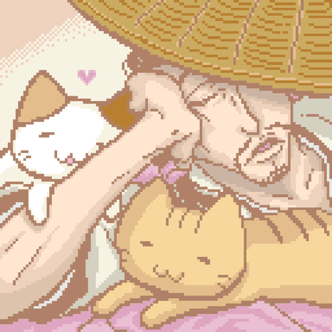 「来たみたいだぜ、新入り」 「よろしくニャー」 100年前の護廷、浦原さんが新隊長に任命される日です。 パルニャンは自分が新隊長になる気満々です。 #六車拳西 #BLEACH #パルニャン #ドット絵 #pixelart #dotpict