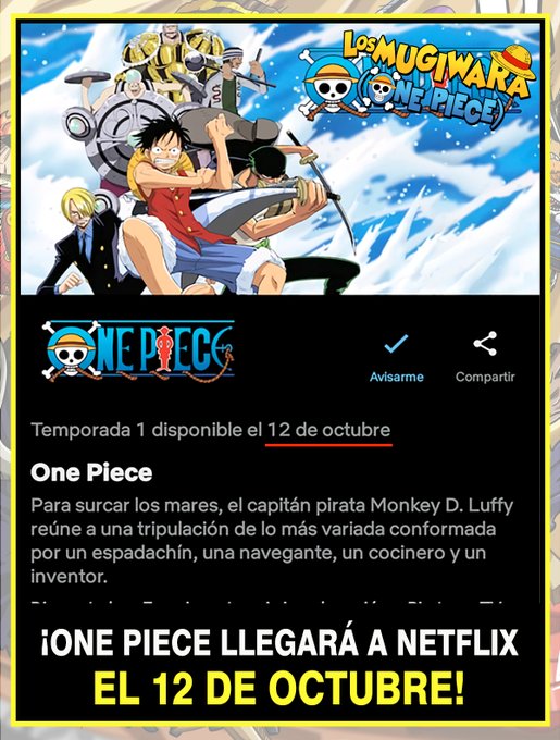 Nakamas, en caso de que todavía no lo sepan, One Piece llegará a Netflix este 12 de octubre o/