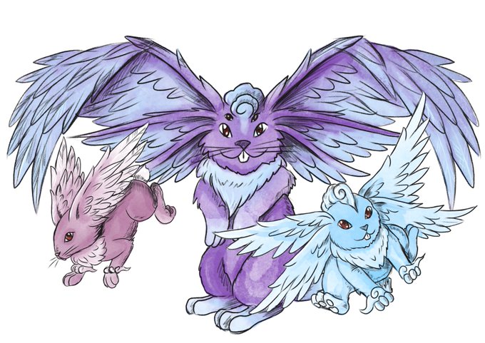 Flappits! My flying rabbit enemies for my JRPG inspired ttrpg. The small pink ones are Cottonwings, slightly bigger blue ones are Glidehops and the big purple ones are Harerazers!