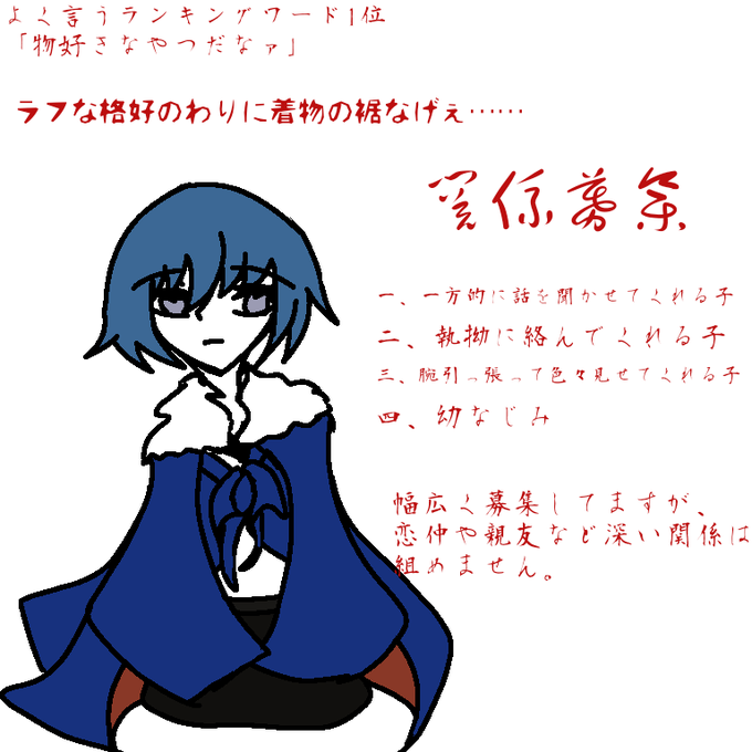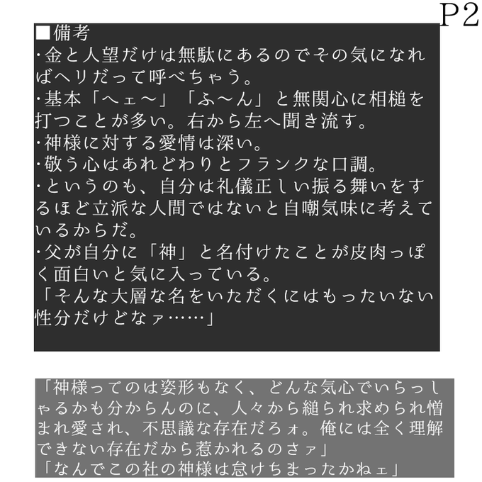 論破のモノ枠。神がテーマなので狂信者みたいなの出したいけど、まだちょっと冷静な感じの子を出したくて。常識人枠の方。いつも檣燦様に振り回されてるけど「光栄だわァ」らしい。自分を卑下しがち。ネチコャンと一緒にいる。
