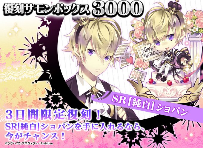 【まもなく終了】3日間限定【復刻サモンボックス】は明日6/10(土)12:00まで!ウェディングver【SR[純白]ショパン】をぜひお見逃しなく!(※復刻サモンボックスは偉人のみの販売となります。) #ラヴヘブン
