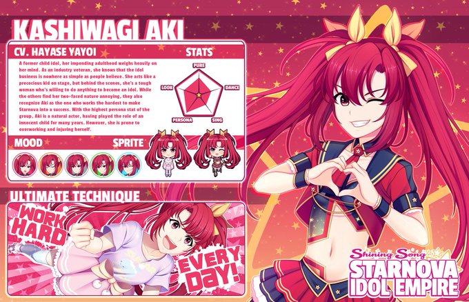 Aki is hard at work in her spotlight maintaining her high starting PERSONA. Careful though, while she gains EXP faster she also loses HP faster than other idols. Her ultimate technique further boosts her EXP gain