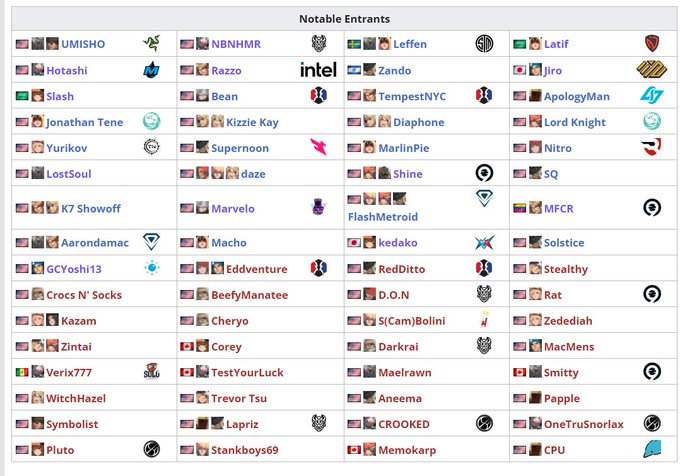 tampa never sleeps number sixty two is starting in roughly five minutes! here is a list of notable entrants and character usage among them, EXTREMLEY stacked bracket with alot of either returning pros or psn locked players!