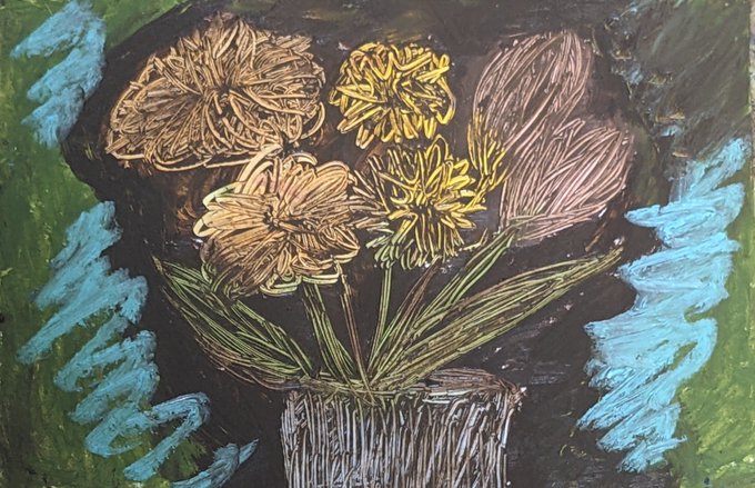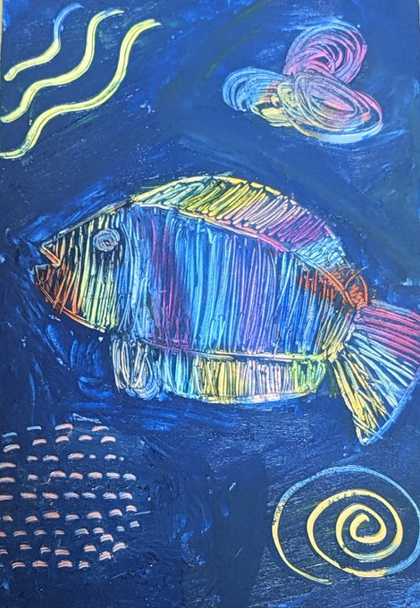 スクラッチアートでお魚、お花×2描いてみた。全部真っ黒なのは嫌で、背景塗ったり茶色やブルーにしてみたりした。 #障害者アート