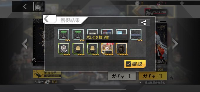 天井のつもりで引き続けたら出てきた。9が出た瞬間、引換券は600枚になった。可愛いからええか #ドルフロ