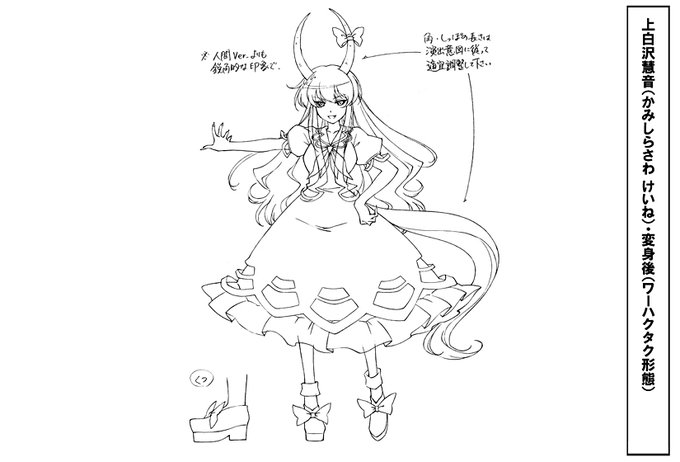 慧音先生の人間姿は単体のキャラ表は存在せず、妹紅や藍・橙と一緒に描かれた簡易版のみなんですが、華鳥風月PV制作の際に描いたハクタク姿の追加設定ならあるので、それを載せときますねー