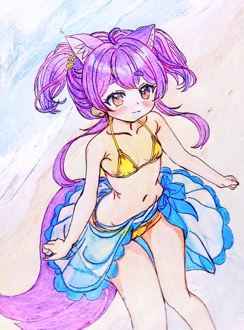 夏が終わる前に。 #ぽこん奉納絵 #狐桜こはく #杜狸ましろ #アナログイラスト #水着