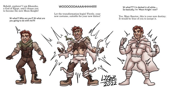 A very sexy rendition of Marc Spector's origin story transformation into Moon Knight as an anonymous comm! This Moon Knight is from the Lemire run of the comics. 🏜️💪🏼🌙