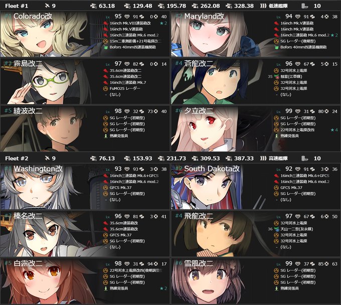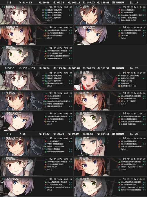 使用編成です。 (各編成の左上に該当海域の番号が書かれています。) #艦これ