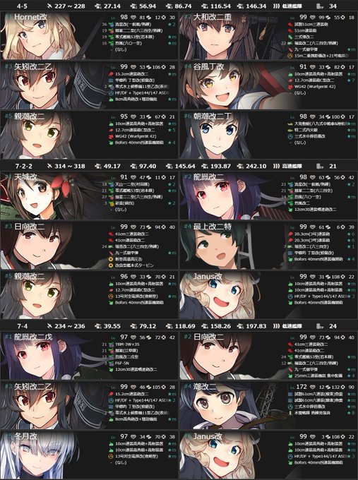 使用編成です。 あちこち歩き回るのに忙しかったけど! (各編成の左上に該当海域の番号が書かれています。) #艦これ