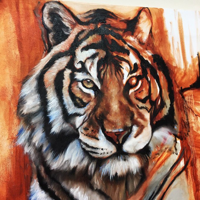 Finished a painting today 😊A rather fuzzy photo sadly but, as you can see in comparison to me, it’s a rather large painting but I’m quite happy with how he came out! #tiger #wildlife #cat #CatsOfTwitter #painting #artist #art #TuesdayMotivation