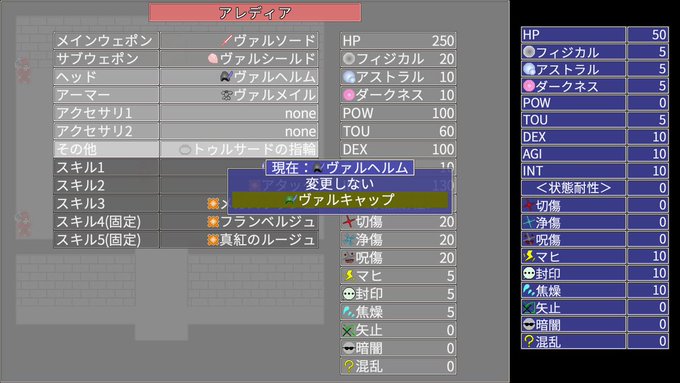 #プレミアムウディタデー <ゲ制進捗>装備と所持品の機能、 あと名前変更(マウス操作用に簡易なソフトキーボードも作成)。 次は……キャラチップとか背景を描いてく予定。主人公に男3人と獣3匹を追加したい。ちょい犬化してみたが意外と楽にいけそう?あと猫と…うーん、何にしようか