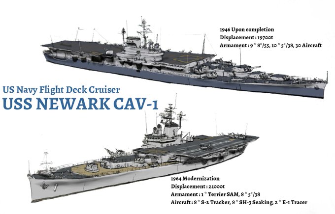 アメリカ海軍航空重巡洋艦ニューアーク。菊池型を圧倒するべく建造された20000tの巨艦。ボルチモア級に匹敵する火力と菊池に倍する30機の搭載機数を有する。60年代に対潜巡洋艦に改装された。