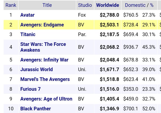 アベンジャーズ エンドゲーム、公開からたった5日で12億ドルを超えてハリウッド歴代18位にいきなりランクイン。