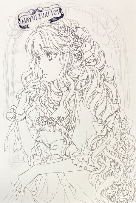途中でラプンツェルをイメージ。ドローイング以外カラー絵を黒でペン入れする事無いので新鮮。(いつもは主にマルチライナーワイン色を使用)