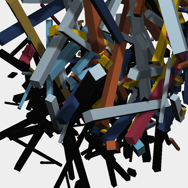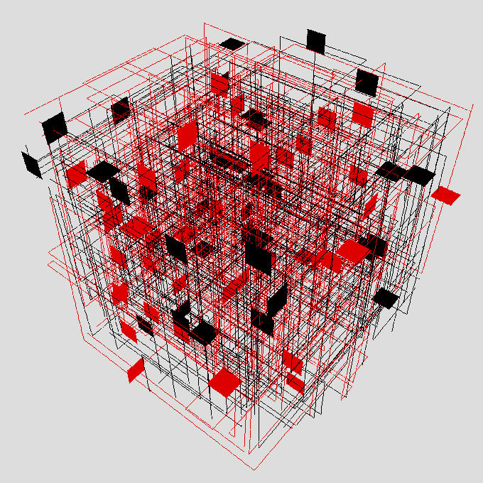 A conceptual interpenetration of two three-dimensional structures made up of lines and squares generated by chance.