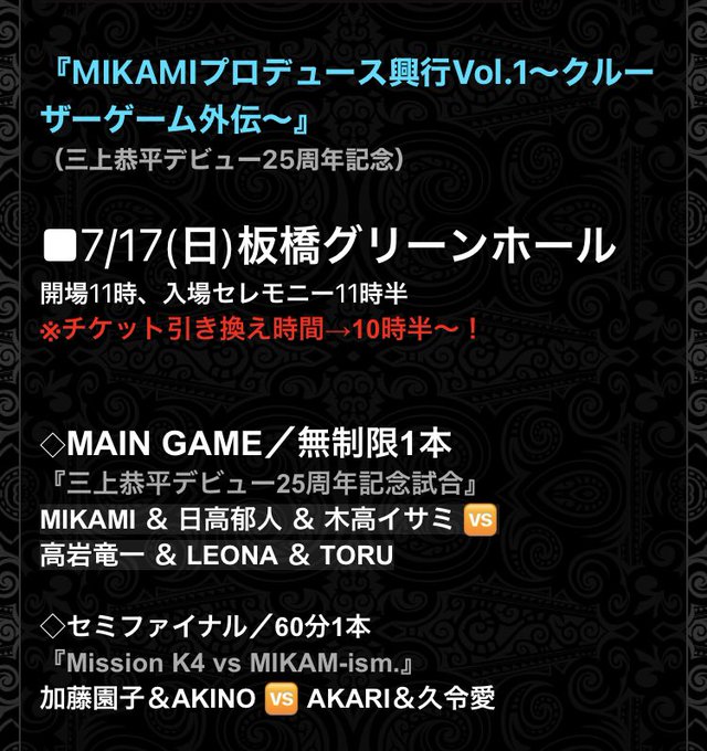 上記大会グッズ売店にて7.17クルーザーゲーム板橋大会のチケットを販売致します
