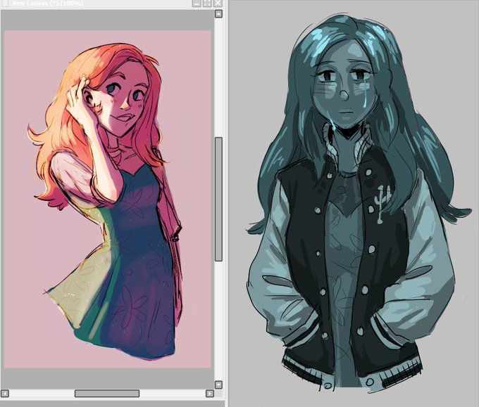 i did an aggie./io collab with @clarabellumsart tonight!! Featuring my Audrey. She drew the one on the left, I drew the one on the right, and then we coloured each other's drawings! 🤩☺️💕