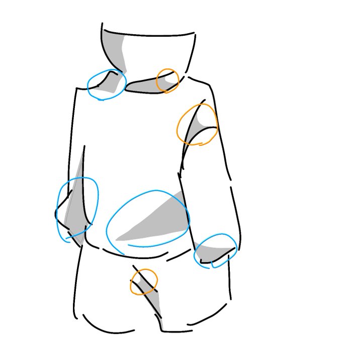 @Rinasnnda5301 影ですね!私はあまり光源気にせずぱっぱと雰囲気で付けるんですが例えば下の絵のオレンジで囲まれてるところは丸くシワにそって影をつけます!青で囲まれてるところは四角や三角などカクカクした影をつけることが多いです😊あとは影をあまりつけすぎないことにも気を使ってますね。参考になりますかね