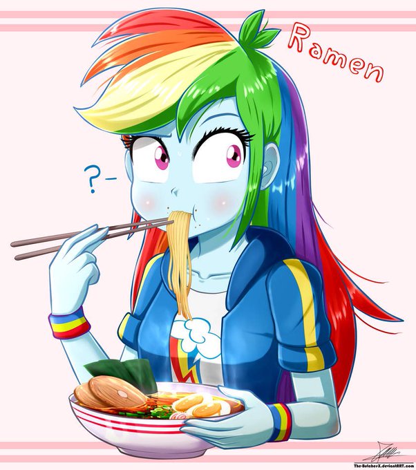 Rainbow Dash is tasting the Ramen Soup that Min Min gave her to see if it’s delicious.