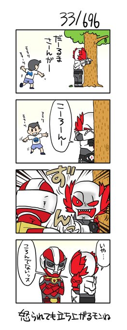 696回戦う怪人 310と311/696 #4コマ #4コママンガ #ヒーロー #ローカルヒーロー #漫画が読めるハッシュタグ