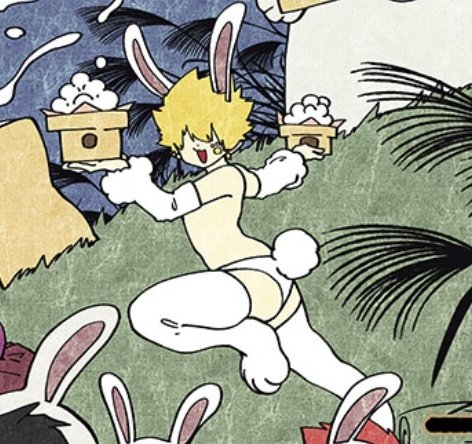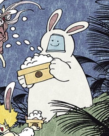 We see a Goliath up in the moon, this is a reference to how it is said that you can see a rabbit in the moon hammering mochi. Seems like it's a dog this time round. This also explains the family's bunny attire.