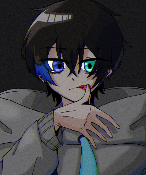 @KuroMai0706 目の色はまあ、見ての通りですわ、髪は青いメッシュが入る茶髪( -`ω-)b 服はパーカー