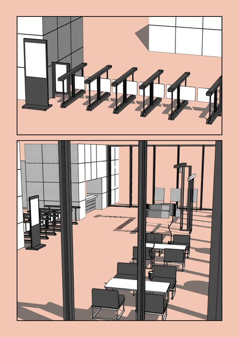 レイアウト若干変更してからセキュリティゲートとデジタルサイネージで今風の建物っぽく。