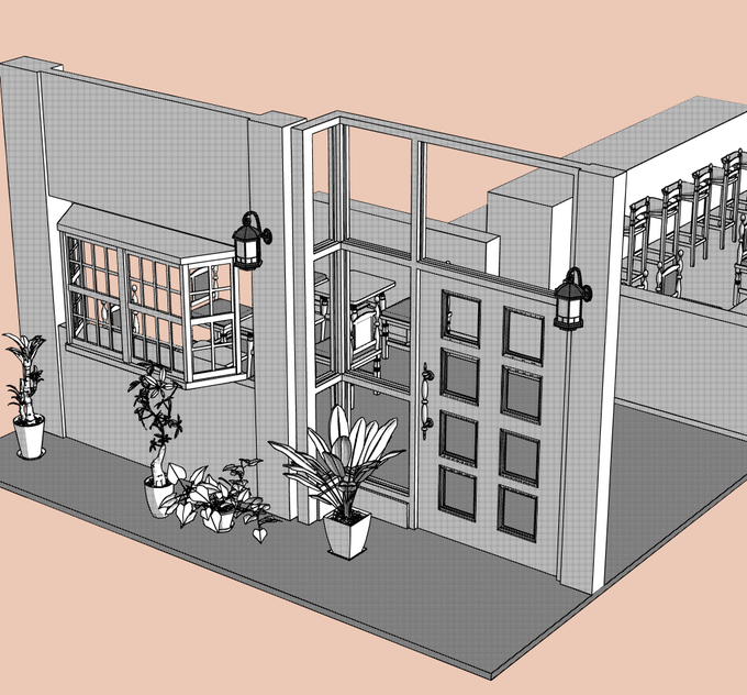 昭和感のあるサ店の椅子てなんか曲線の装飾多いよなぁとか、なんかテーブル低ないかとか隣とのテーブルの間隔ちょっと狭めやったなぁとか、最近行った店とか思い出しながら作ってる。