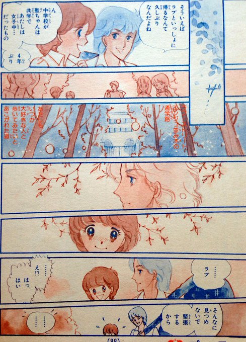 #絶版マンガ図書館 ラブストリート全6巻の公開が始まりました。コミックスでは、白黒印刷されているカラーページの原画を、1日1枚UPしています。今日は1巻若草の章の本文6P目。http://t.co/QicdPM9ZfT …
