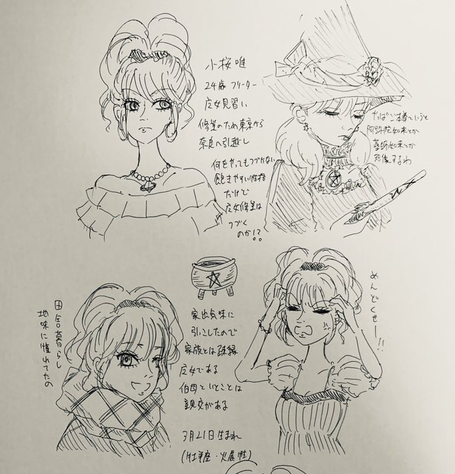 BBを意識したキャラデザだったため初期案では欧米顔だった。あと家族とは勘当したような設定はボツにして、登場してないけどごく平和な実家です。連載開始時すでにある程度幼い顔になって3枚目の左上コマの感じで落ち着いた。