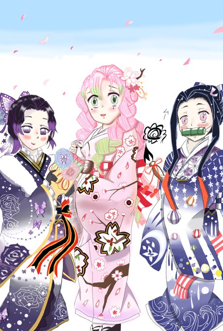 年賀状の裏に描いた絵に色を塗ってみました♪ #胡蝶しのぶ #甘露寺蜜璃 #竈門禰豆子 #年賀状 #あけおめ #晴れ着