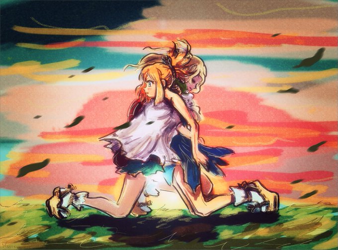 @dcstfslashweek: my last contribution to the event is Suika hugging Kohaku ("role reversal AU" prompt--not really an AU, but the role reversal is there)! 🍈🦍🌄