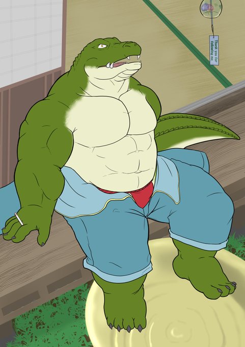 暑中見舞い 完成版 / summer greetings 遅まきながら、1K Followerへの感謝も兼ねまして。 縁側で一服点ける鰐さん。 一番頑張ったのは多分水。